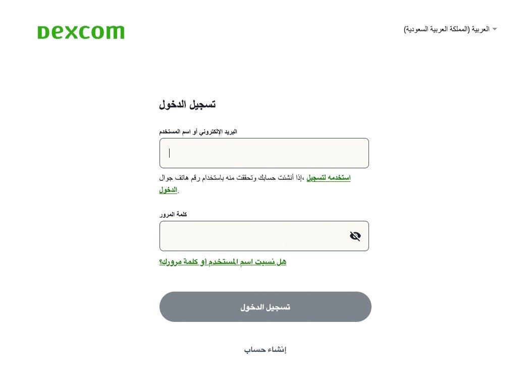 الخطوة 2: سجّل الدخول من خلال بيانات حساب Dexcom إذا لم يكن لديك حساب، الرجاء إنشاء حساب.