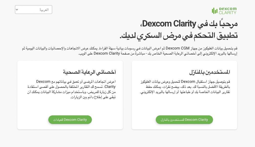 الخطوة 1 - سجل الدخول إلى Dexcom Clarity على كمبيوترك المحمول أو كمبيوترك المكتبي، من خلال زيارة https://clarity.dexcom.com واضغط على "Dexcom Clarity للمستخدمين المنزليين"