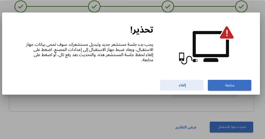 بالإضافة إلى ذلك، وكجزء من عملية التحديث، سوف تحتاج إلى إنهاء جلسة المستشعر وبدء جلسة جديدة بعد تحديث جهاز الاستقبال. سوف تمحى بيانات جهاز الاستقبال من جهاز الاستقبال، وسوف يعاد ضبط جهاز الاستقبال إلى إعدادات المصنع خلال التحديث. سوف تحفظ البيانات في جلسة مؤقتة غير معروفة، وسوف تتاح لمدة 24 ساعة فقط. يمكنك توليد وتحميل تقرير خلال هذا الوقت، لكن لن تحفظ البيانات.