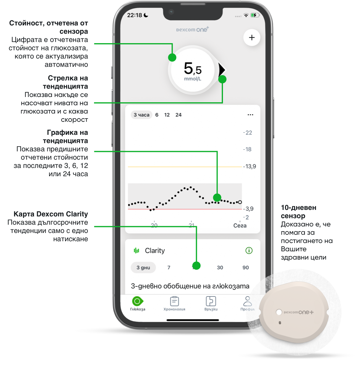 Dexcom ONE+ е придружен с Dexcom Clarity, който забелязва посоките и тенденциите на глюкозата Ви вместо Вас, така че да разбирате по-добре как ежедневните дейности влияят на нивата на глюкозата Ви.¶ Можете дори да споделяте данните си с Вашия лекар за по-персонализирана грижа.†††