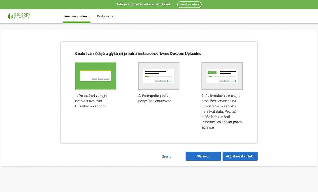 1. krok: Na svém počítači otevřete stránku kliknutím zde https://clarity.dexcom.eu/user/anonymous-update?locale=cs-CZ. Webová stránka se otevře v novém okně