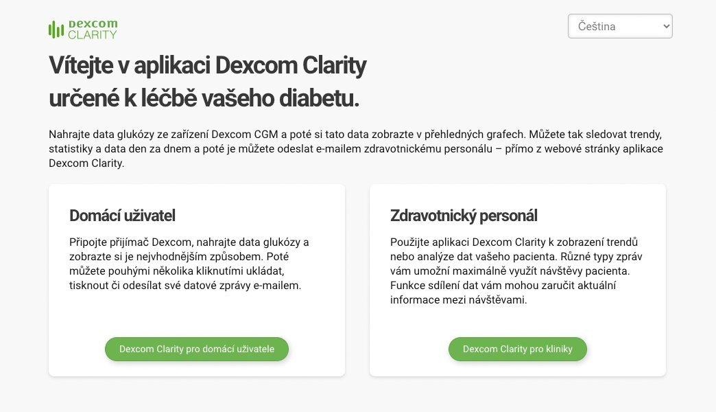 1. krok – Přihlaste se do Dexcom Clarity na svém notebooku nebo počítači na adrese https://clarity.dexcom.eu/ a klikněte na “Dexcom Clarity pro domácí uživatele“