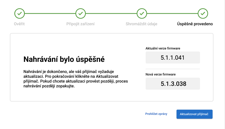 5. krok: Po úspěšném dokončení nahrávání uvidíte verzi níže ukázané obrazovky, která vás informuje o nutnosti aktualizovat váš přijímač na verzi 5.1.3.038. Klikněte na tlačítko „Aktualizovat přijímač“ v pravém dolním rohu obrazovky.