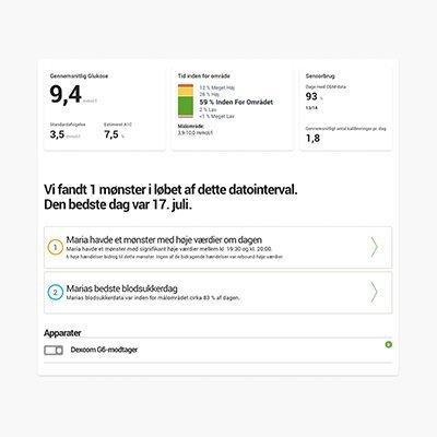 Dexcom Clarity kan du oprette patientkonti, så du kan uploade og se CGM-data i forbindelse med konsultationer. Du kan se interaktive rapporter og derefter gemme og udskrive dem efter behov. Du kan invitere patienterne til at bruge Dexcom Clarity-appen og dele deres CGM-data med dig, så du kan opnå endnu mere effektive konsultationer på klinikken eller via telefon.