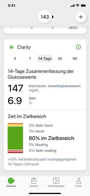 Durchschnittliche Glukose: Der Durchschnitt aller CGM-Messwerte im ausgewählten Datumsbereich.