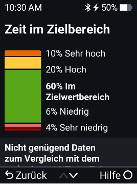 Zeit im Bereich: Zeigt den prozentualen Anteil der Zeit an, in der die Glukosewerte im niedrigen, im Ziel- und im hohen Bereich liegen. Nachfolgend sind die empfohlenen Bereiche aus einem internationalen Konsens aufgeführt:
