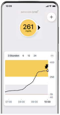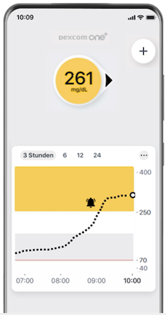 Um Ihr Dexcom ONE+ als Hilfsmittel zur Beobachtung und für Behandlungsentscheidungen zu nutzen - und um Insulinstapelungen zu vermeiden - könnte Ihr medizinischer Betreuer Ihnen raten, die Funktion "Wiederholungsalarm" in Ihrer Einstellung "Hohe Alarmstufe" zu aktivieren. Auf diese Weise werden Sie, wenn Sie eine hohe Alarmstufe erhalten und diese bestätigen, nach einer von Ihnen gewählten Zeit erneut benachrichtigt. Der Alarm wird so lange wiederholt, bis die Messwerte Ihres Dexcom ONE+ wieder im Zielbereich liegen. Ein Wiederholungsalarm ermöglicht es Ihnen, einen angemessenen Zeitpunkt für Entscheidungen zum Diabetesmanagement festzulegen, und erinnert Sie daran, Ihre Messwerte zu einem späteren Zeitpunkt zu überprüfen, um sicherzustellen, dass Ihre Gewebeglukosewerte gesunken sind.