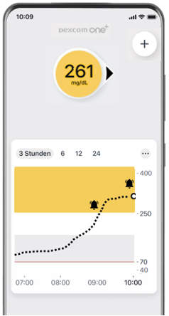 Ihr Dexcom ONE+ bietet Ihnen außerdem zwei großartige Funktionen, die Ihnen beim Alarmmanagement helfen - Schlummern und Verzögerung der 1. Hoch-Warnung.