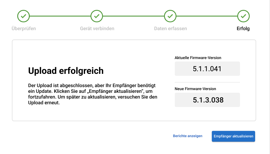 Schritt 6: Sobald die Daten erfolgreich hochgeladen wurden, wird eine Version des nachstehenden Bildschirms angezeigt, der Sie darüber informiert, dass Sie Ihren Empfänger auf Version 5.1.3.038 aktualisieren müssen. Klicken Sie auf die Schaltfläche „Empfänger aktualisieren“ in der unteren rechten Ecke Ihres Bildschirms.