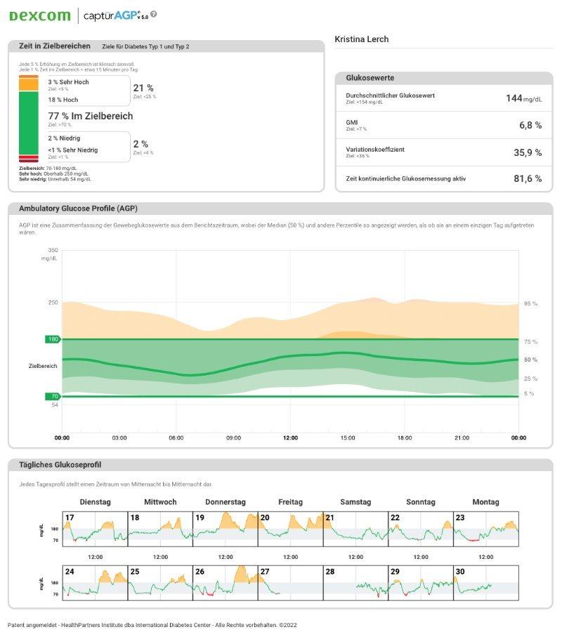 Das AGP ist ein standardisierter Glukosebericht, erstellt vom International Diabetes Centre, der verschiedene Datenpunkte verwendet, um Muster mit Statistiken, einem Trenddiagramm und Tagesprofilen abzubilden.