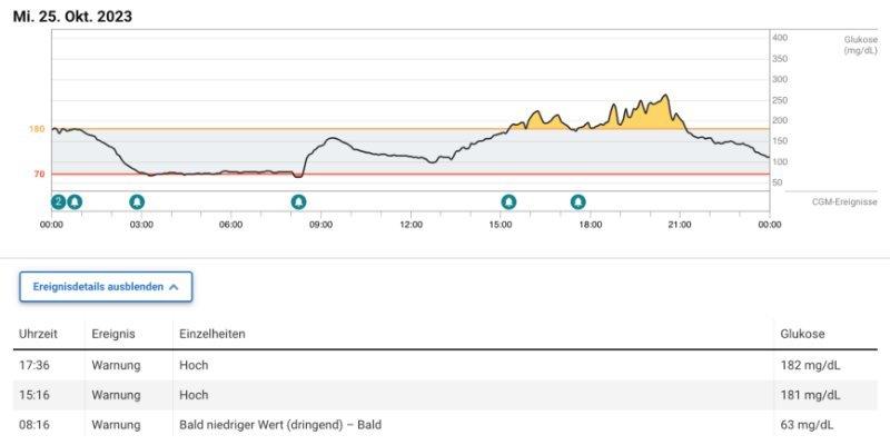 Die tägliche Ansicht ermöglicht es Anwendern und Anwenderinnen, alle Gewebeglukosewerte über einzelne Tage sowie isolierte, von der Patientin oder dem Patienten eingegebene Ereignisse an den einzelnen Tagen zu analysieren.