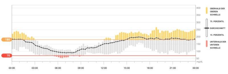 Trendberichte bilden die Gewebeglukosetrends von Patientinnen und Patienten zu unterschiedlichen Tageszeiten und über einen ausgewählten Datumsbereich ab. Sie können zum Beispiel den Trendbericht einer Patientin oder eines Patienten heranziehen und feststellen, dass der Gewebeglukosespiegel morgens stabil, aber nachmittags weniger stabil ist.
