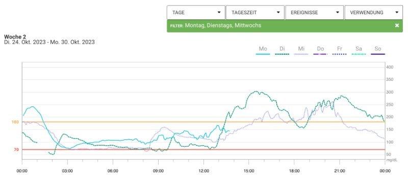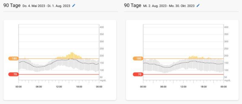 Vergleichsdiagramme heben Änderungen im Diabetesmanagement zwischen zwei verschiedenen Zeiträumen hervor und erleichtern so die Überwachung des kurz- und langfristigen allgemeinen Fortschritts einer Patientin oder eines Patienten. Die Funktion hilft auch bei der Visualisierung spezifischer Änderungen, beispielsweise der Auswirkung einer Medikationsanpassung über Tage, Wochen oder Monate.