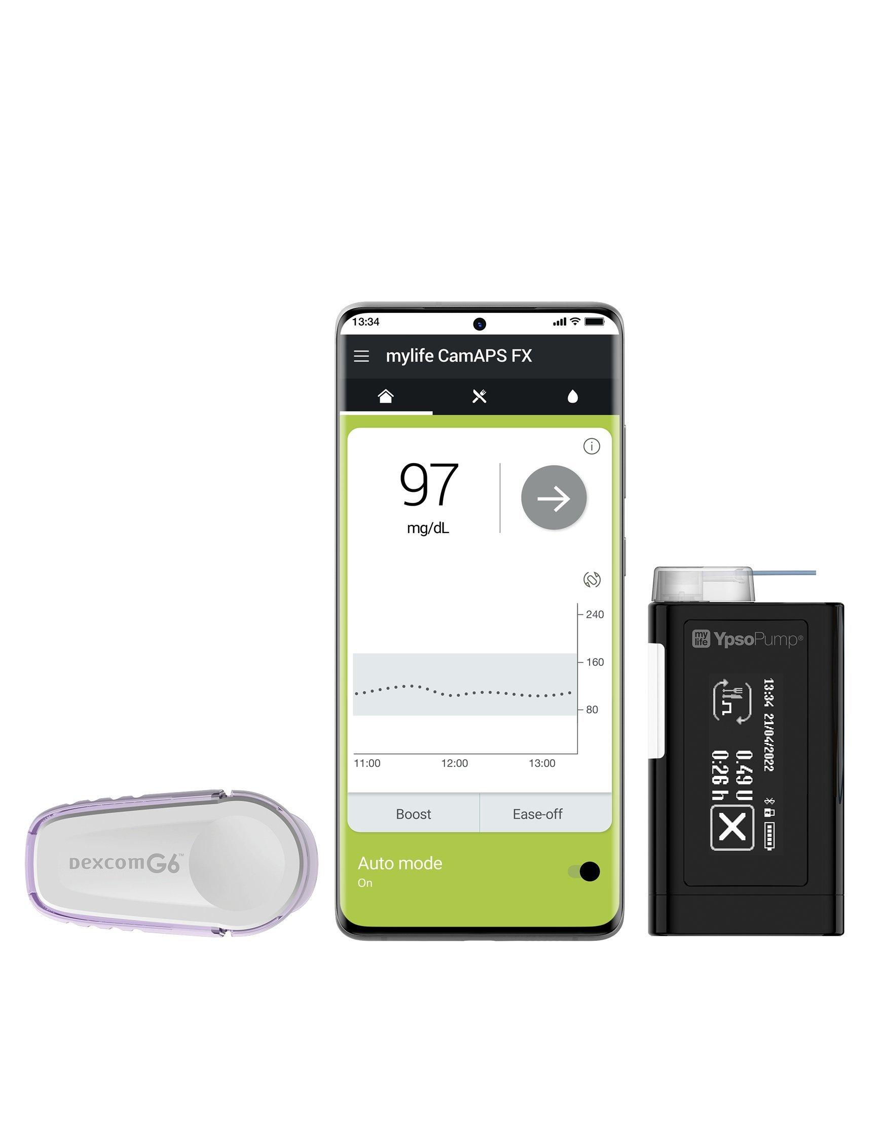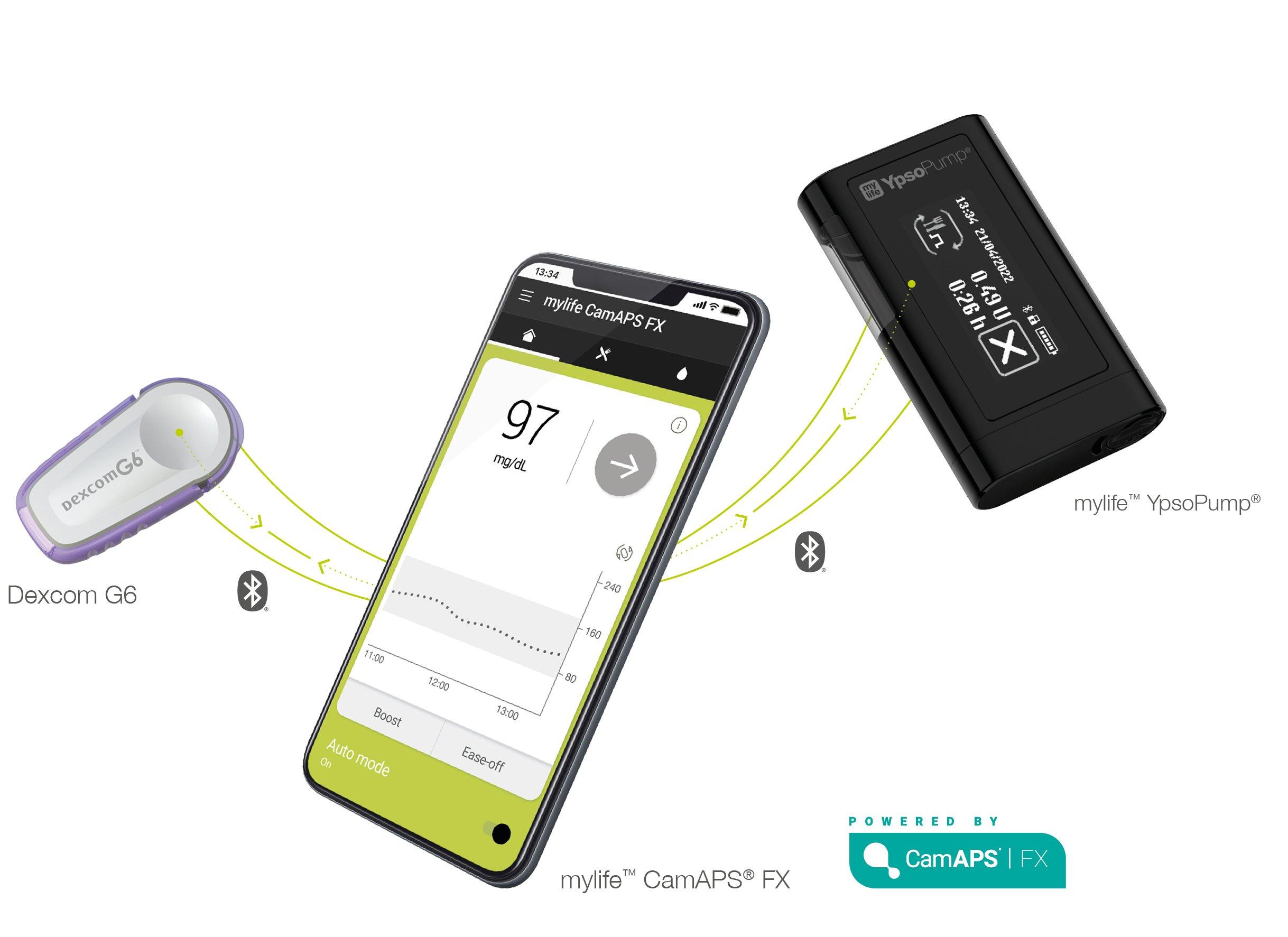 Der mylife Loop besteht aus der mylife YpsoPump Insulinpumpe, dem Dexcom G6 CGM-System und der mylife CamAPS FX App – auf dem eigenen Smartphone! Der lernfähige Algorithmus passt die Insulinabgabe basierend auf den Daten des Dexcom G6-Sensors an.