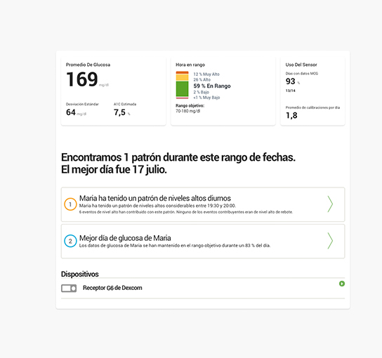 Dexcom Clarity es una parte importante del sistema de monitorización continua de glucosa (MCG) de Dexcom, cuya función es proporcionar una visión de tus datos previos de diabetes y destacar los patrones de glucosa, las tendencias y estadísticas.