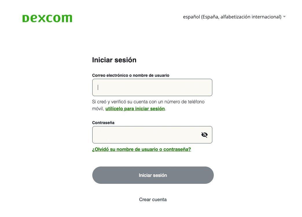 Paso 2: Inicia sesión con tus credenciales de Dexcom. Si no tienes cuenta, crea una.