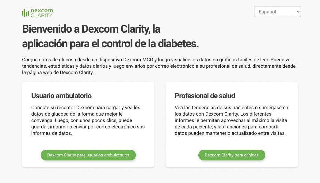 Paso 1: Inicia sesión en Dexcom Clarity en tu ordenador portátil o de sobremesa desde el link https://clarity.dexcom.eu/ y haz clic en Dexcom Clarity para usuarios ambulatorios.