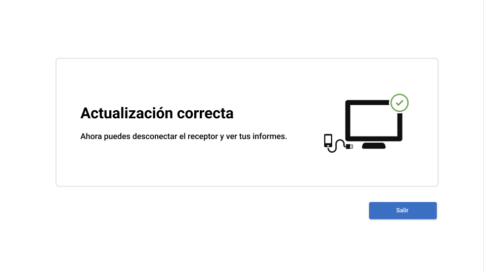 Una vez finalizada la actualización, aparecerá una pantalla en la que se confirma que la actualización finalizó con éxito. Presiona el botón «Salir», desconecta el receptor e inicia una nueva sesión del sensor.