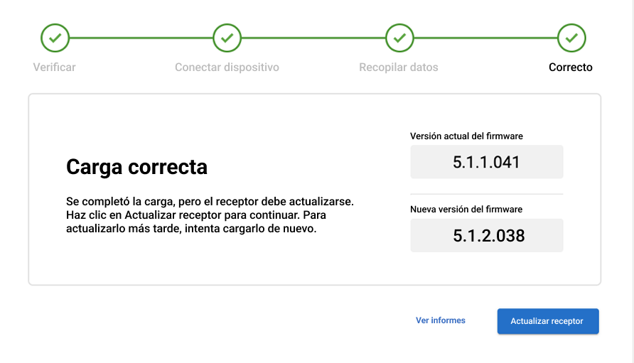 Paso 6: Una vez que la carga de datos se haya realizado correctamente, se mostrará la pantalla que aparece a continuación notificándote que actualices tu receptor a la versión 5.1.2.038. Haz clic en el botón «Actualizar receptor» situado en la esquina inferior derecha de la pantalla.