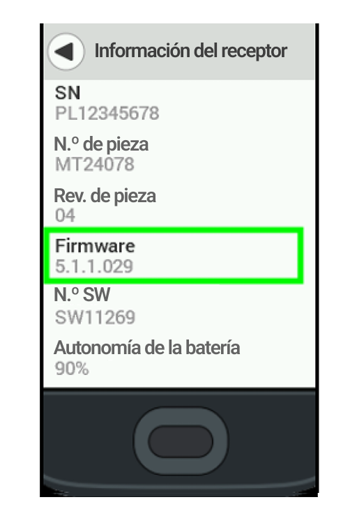 Ten en cuenta que esta imagen es solo un ejemplo de donde se encuentra el número de firmware dentro de la pantalla del receptor Dexcom G6. El número de firmware para esta actualización es: 5.1.2.038