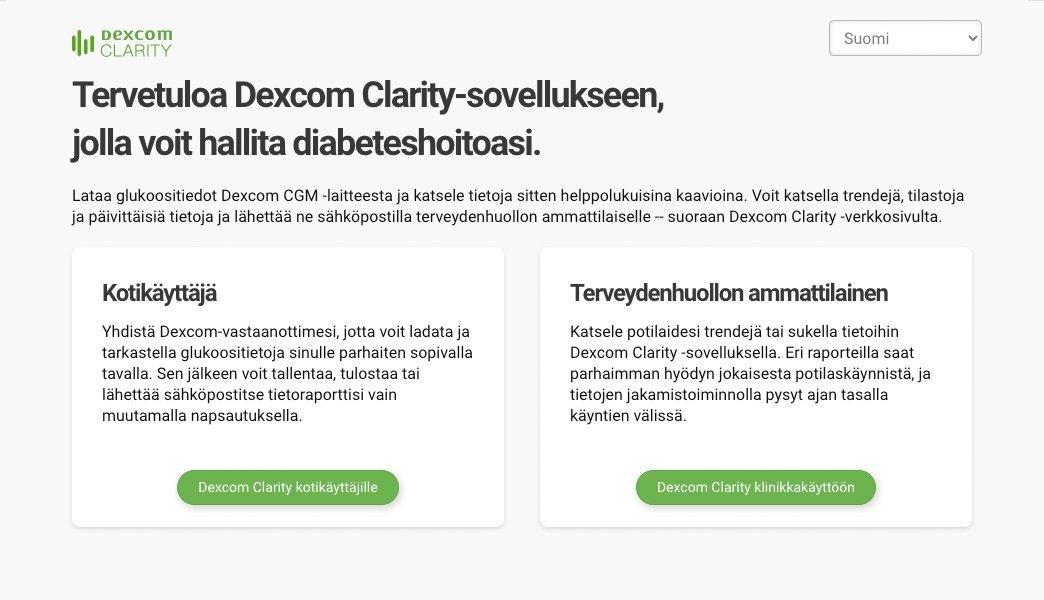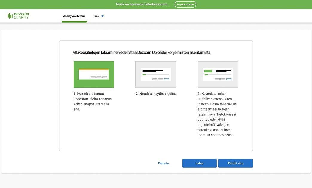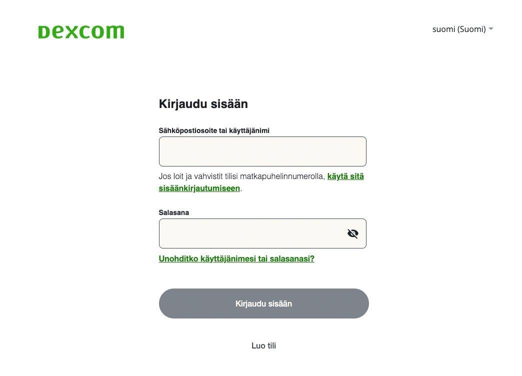 Vaihe 1: Klikkaa tietokoneellasi tästä siirtyäksesi osoitteeseen https://clarity.dexcom.eu/user/anonymous-update?locale=fi-FI Tämä verkkosivu aukeaa uuteen ikkunaan
