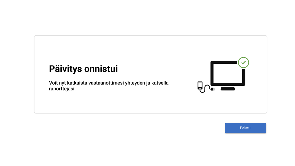 Kun lähetys on valmis, näet tämän ruudun, jossa vahvistetaan, että päivitys onnistui. Paina “poistu”-painiketta, irrota vastaanottimesi ja aloita uusi anturin käyttöjakso.