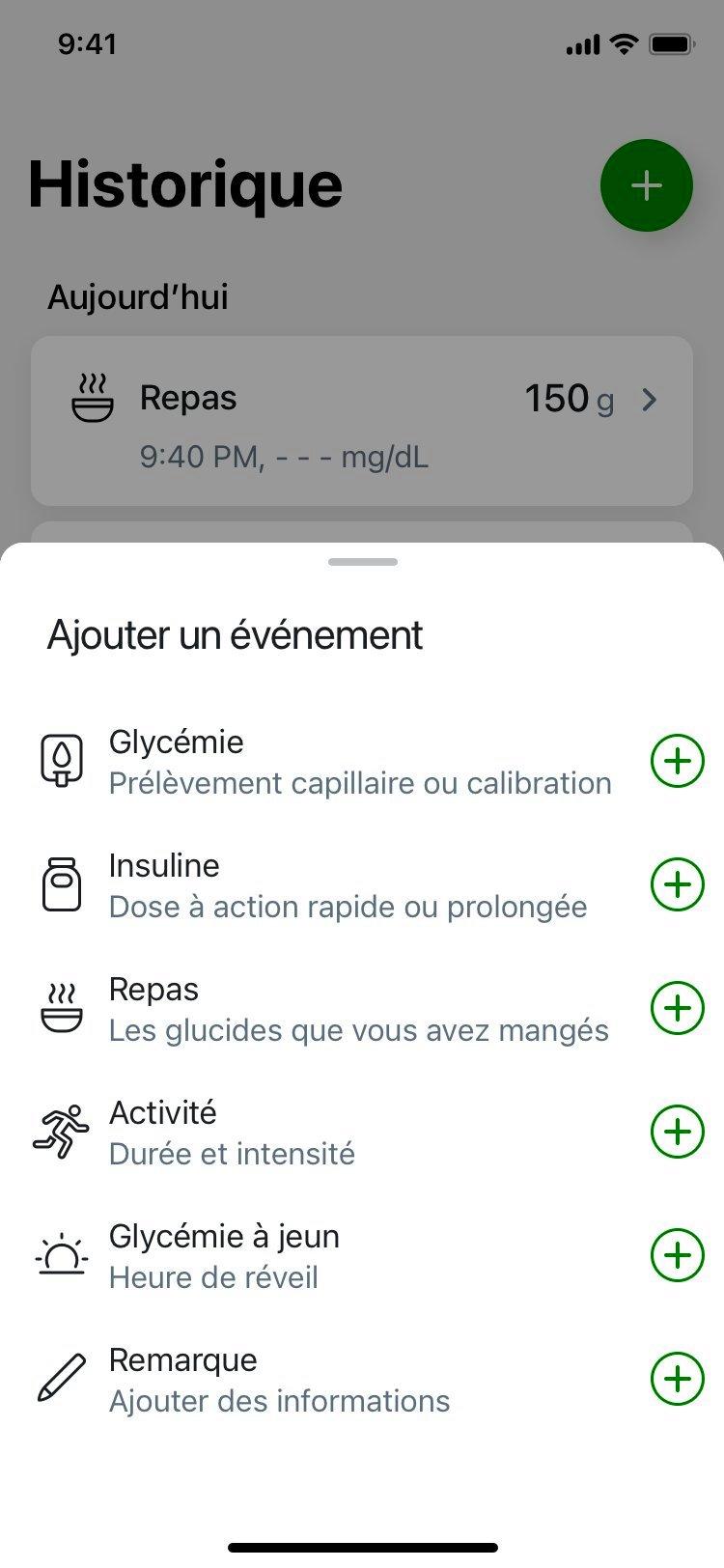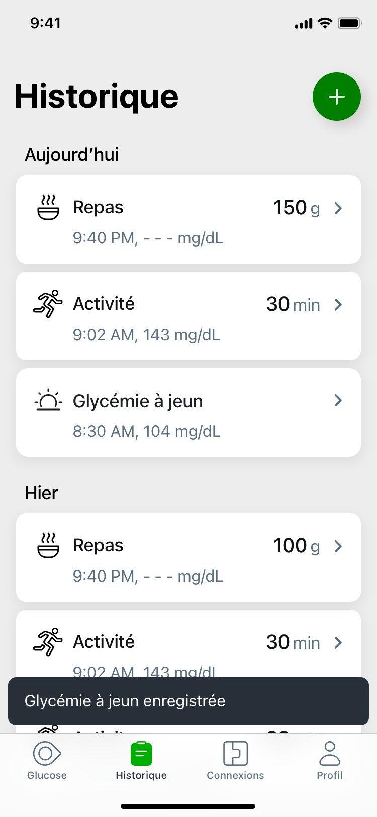 Votre repas sera sauvegardé dans l'onglet Historique. Maintenant, lorsque vous enregistrez un repas, votre glycémie post-alimentation sera enregistrée dans le Dexcom Clarity une ou deux heures après l'enregistrement de votre repas.