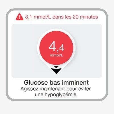 L’alerte prédictive Urgence Bas imminent peut vous avertir jusqu’à 20 minutes avant que votre taux de glucose baisse à 3,1 mmol/L ou moins.