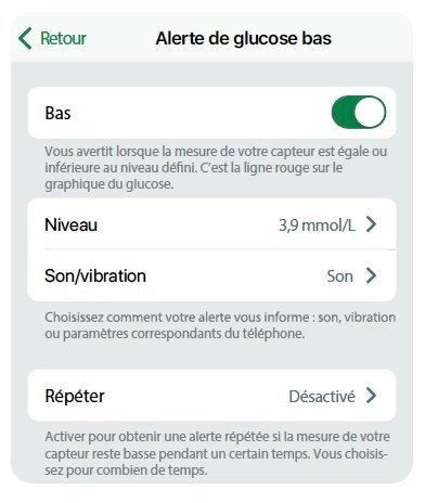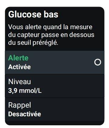 Pour personnaliser chaque alerte, allez à Profil > Alertes. L’écran d’alerte de glucose bas affiche certains des paramètres que vous pouvez modifier :