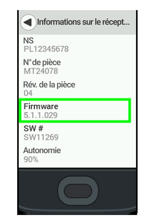 Attention, cette image n’est qu’un exemple de l’emplacement du numéro de firmware sur l’écran du récepteur Dexcom G6. Le numéro de firmware de cette mise à jour est : 5.1.2.038