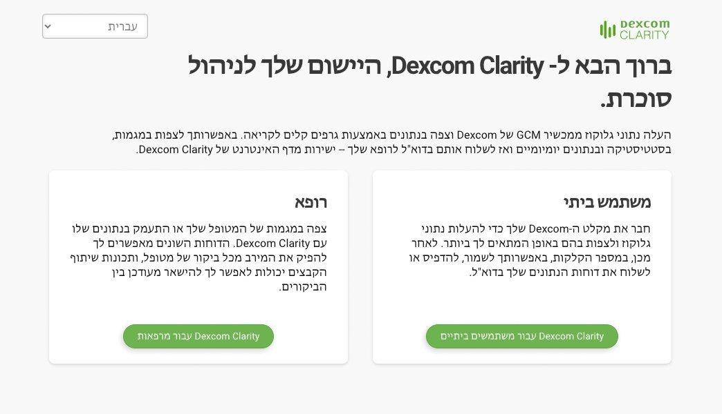 שלב 1 - היכנס ל-Dexcom Clarity במחשב הנייד או השולחני שלך באמצעות ביקור בכתובת https://clarity.dexcom.eu/ ובחר באפשרות "Dexcom Clarity למשתמשים ביתיים"