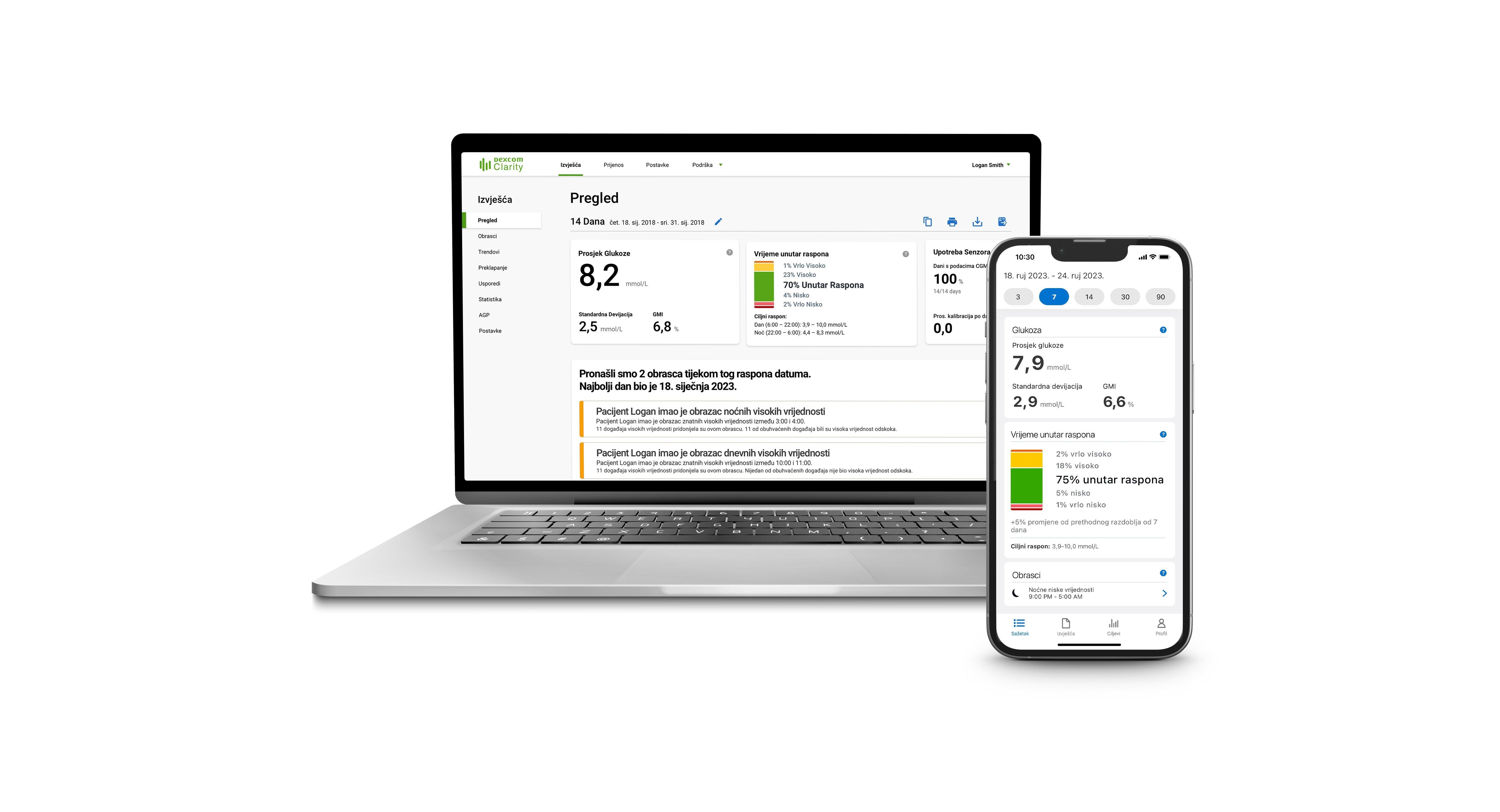 Programu Dexcom Clarity možete pristupiti na Vašem računalu ili kao aplikaciji na kompatibilnom mobilnom uređaju†.