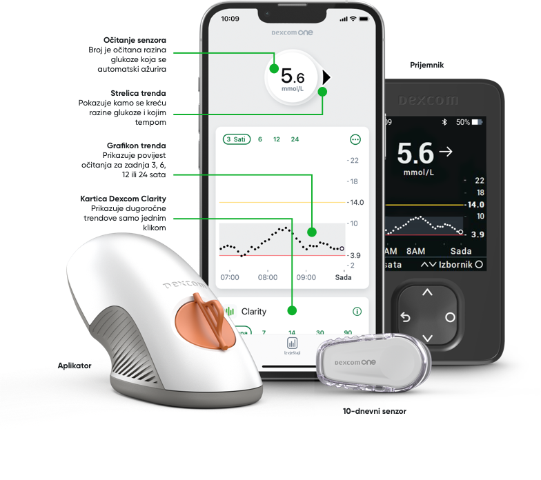 Dexcom ONE sustav ima jednostavan senzor koji†,1 se lako umeće i sveobuhvatnu mobilnu aplikaciju‡ koja prikazuje Vaše podatke u stvarnom vremenu i prošle trendove, kao i obuku u aplikaciji za lakši početak rada.