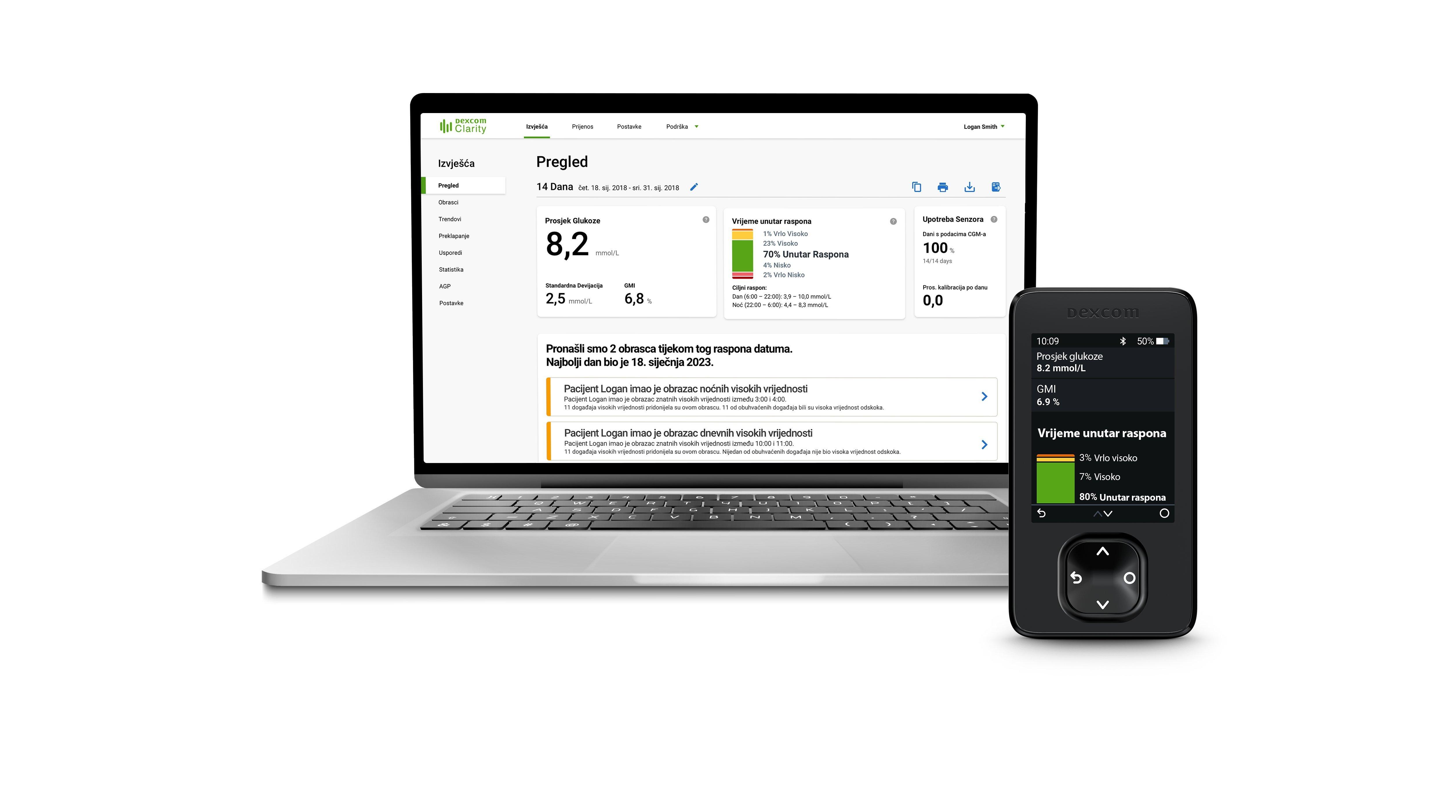 Dodatna izvješća i uvidi o trendovima i obrascima dijabetesa dostupni su na Vašem Dexcom Clarity računu.‡ A budući da je sve dostupno sa samo jednim pogledom, možete ga koristiti za informiranije i učinkovitije razgovore sa svojim zdravstvenim timom.‡