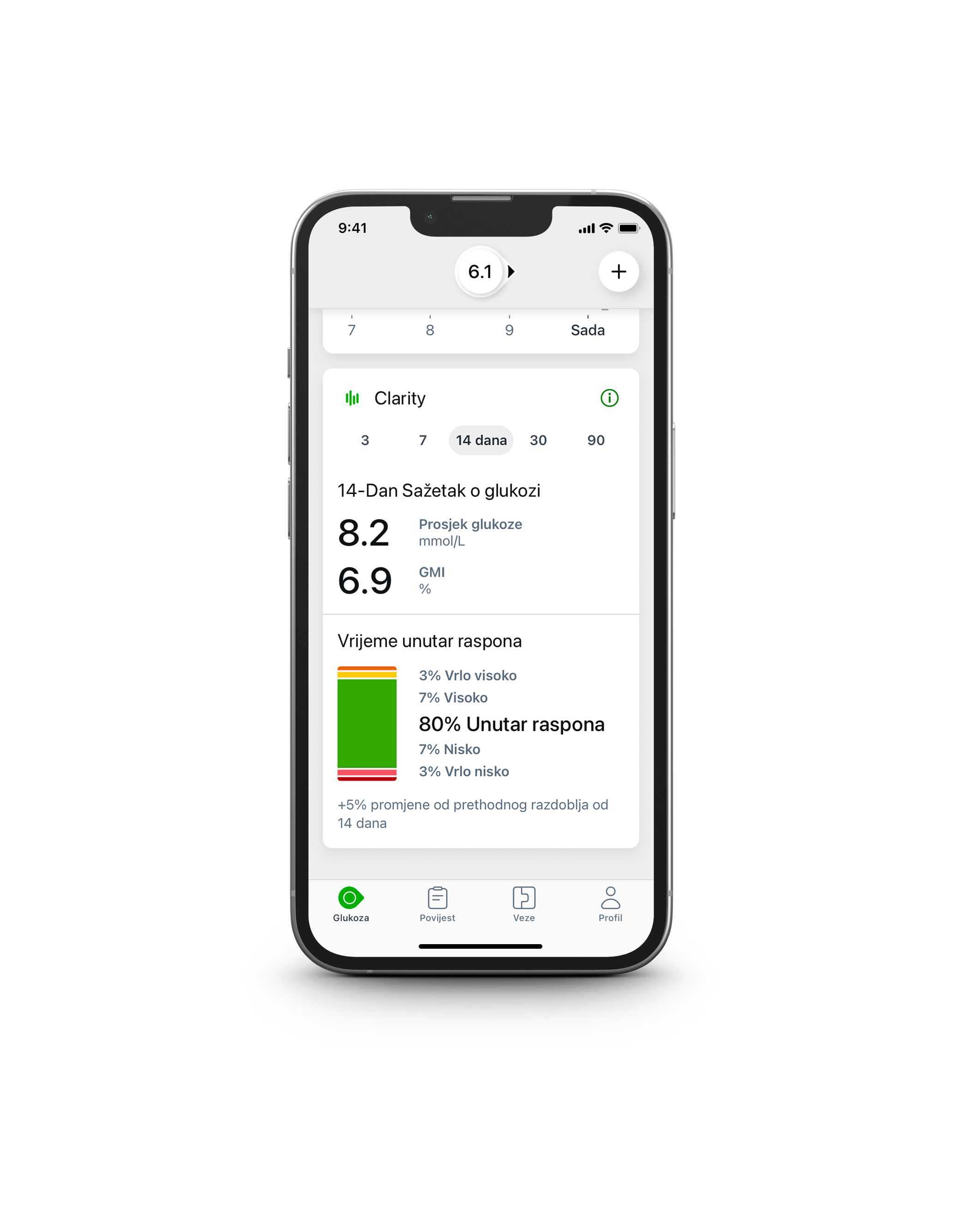 Aplikacija Dexcom pruža brze i jednostavne uvide i izvješća o Vašim očitanjima glukoze. Možete vidjeti sažetak svojih podataka o glukozi tijekom različitih vremenskih razdoblja (3, 7, 14, 30 ili 90 dana) s funkcijom izvješćivanja koja se nalazi na početnom zaslonu. Ovdje možete vidjeti svoju prosječnu glukozu, indikator upravljanja glukozom (GMI) i vrijeme u rasponu. Možete vidjeti svoju glikemijsku metriku u zadnjih 3, 9, 14, 30, 90 dana.