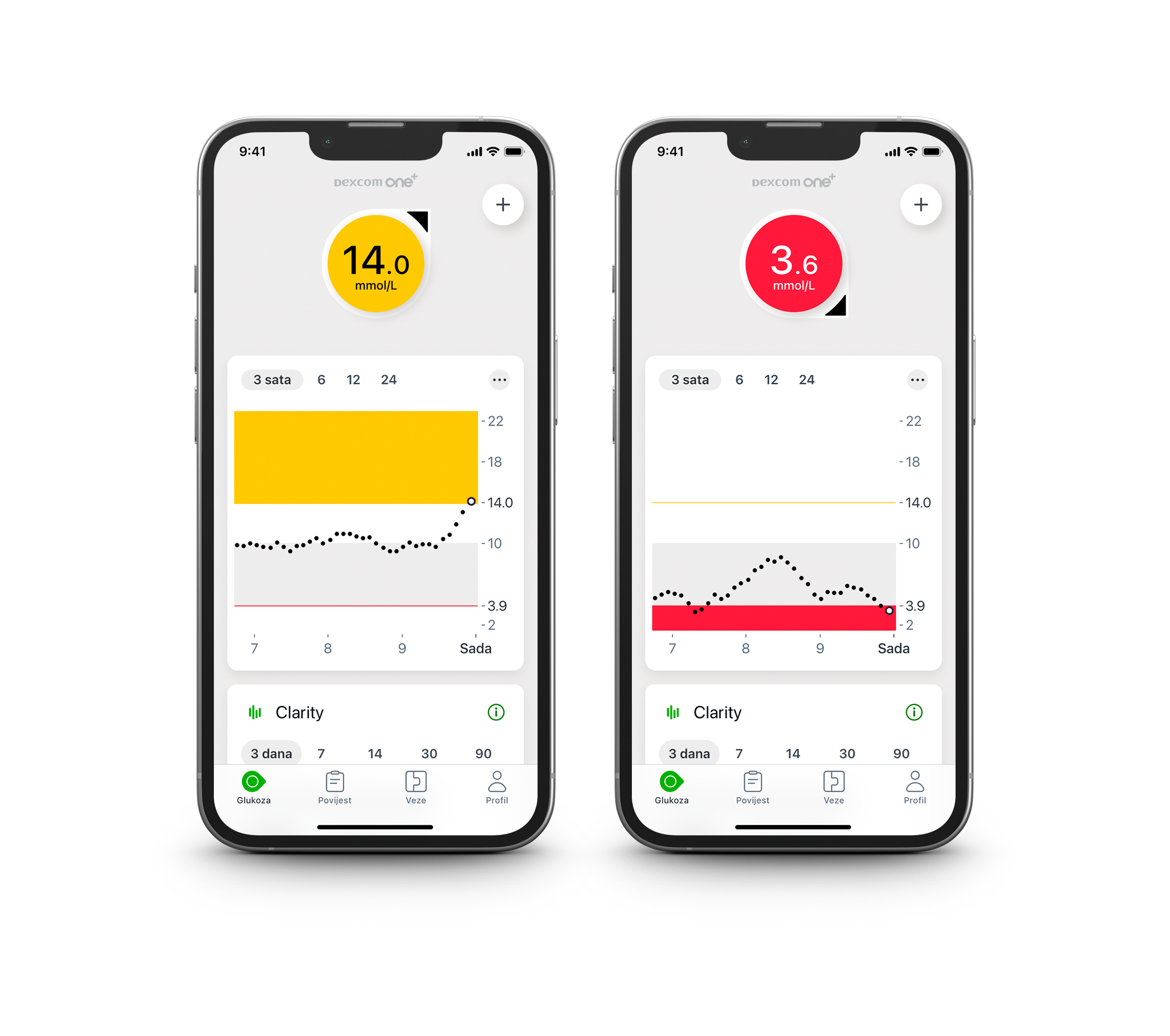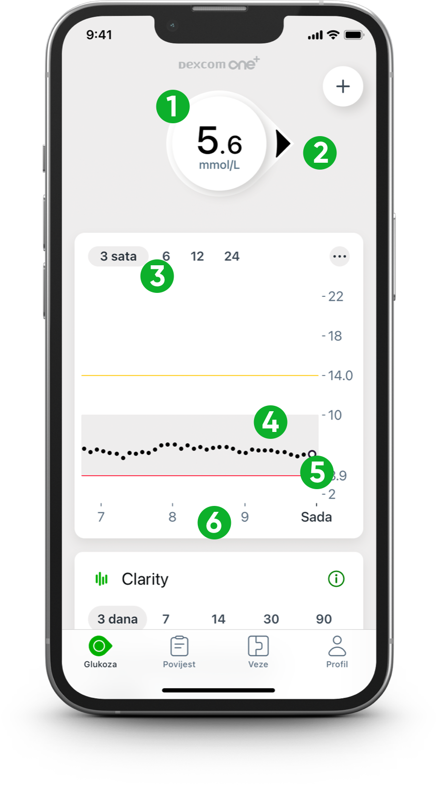 Osim aplikacije Dexcom, također možete preuzeti našu aplikaciju Dexcom Clarity za detaljnija izvješća i uvide.