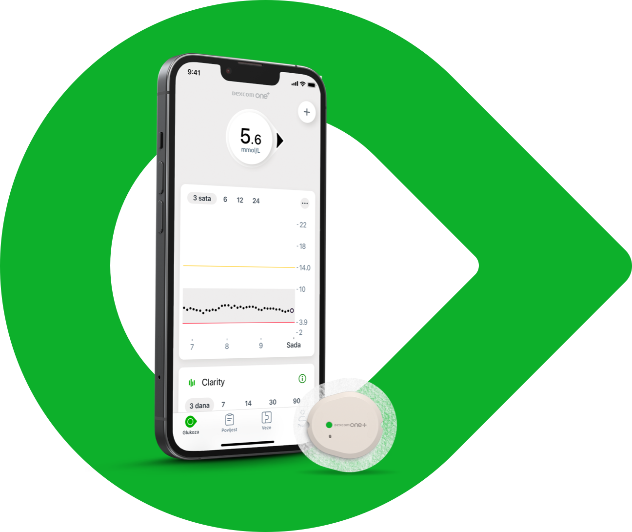 Precizna,†,4 očitanja u stvarnom vremenu poslana izravno na Vaš pametni telefon‡ ili prijemnik,§ 24 sata dnevno, 7 dana u tjednu – tako da svoje razine glukoze možete vidjeti samo jednim pogledom.