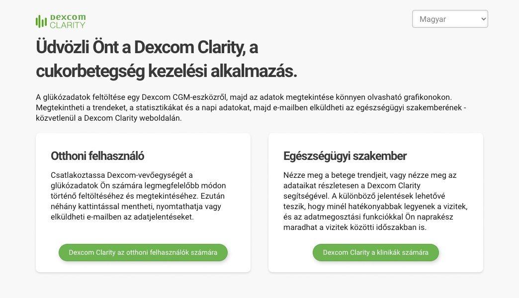 1. lépés – A https://clarity.dexcom.eu/ linkre látogatva laptopján vagy asztali számítógépén lépjen be a Dexcom Clarity fiókjába, és kattintson a „Dexcom Clarity otthoni felhasználók számára” opcióra.