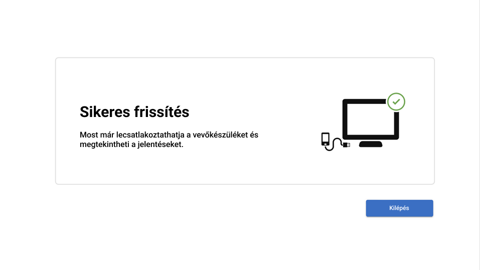 A feltöltés végeztével az alábbi képernyőt fogja látni, amely megerősíti, hogy sikeres volt a frissítés. Nyomja meg a „kilépés” gombot, és húzza ki a vevőkészüléket, majd indítson új érzékelőciklust.