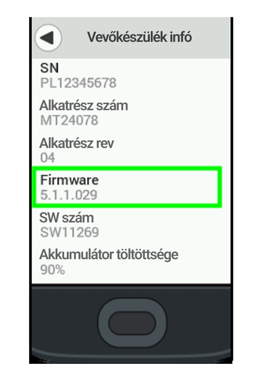 Figyelem! Ez a kép csak egy példa arra, hogy a Dexcom G6 vevőkészülék képernyőjén hol helyezkedik el a firmware szám. A jelenlegi frissítés firmware száma: 5.1.3.038