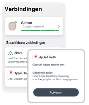 Apple Gezondheid voegt gezondheidsgegevens van uw smartphone, smartwatch en externe apps, zoals Dexcom ONE+, samen. Als u Apple Gezondheid activeert, stuurt Dexcom ONE+ gegevens naar de Gezondheid-app met een vertraging van 3 uur.