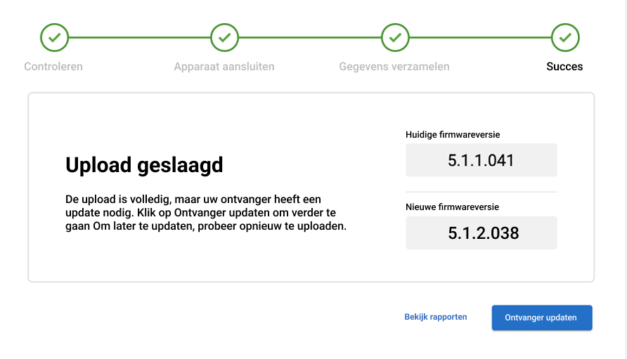 Stap 6: Zodra de gegevensupload geslaagd is, ziet u een versie van onderstaand scherm waarin u wordt gevraagd uw ontvanger te updaten naar versie 5.1.2.038. Klik op de knop “Ontvanger updaten” in de rechteronderhoek van uw scherm.