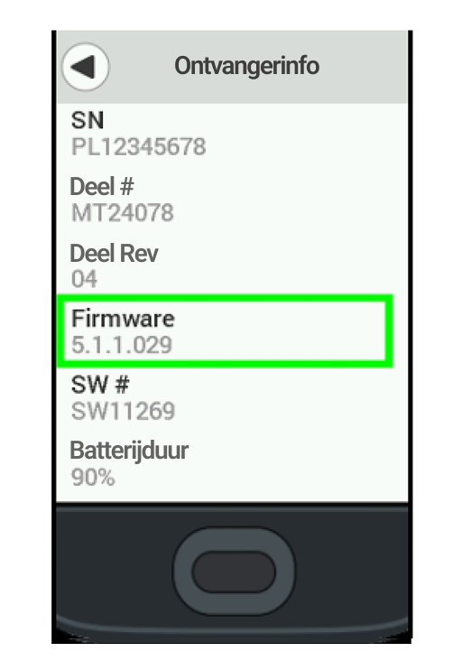 Opgelet: deze afbeelding is slechts een voorbeeld van waar het firmwarenummer zich bevindt op het display van de Dexcom G6-ontvanger. Het firmwarenummer voor deze update is: 5.1.2.038