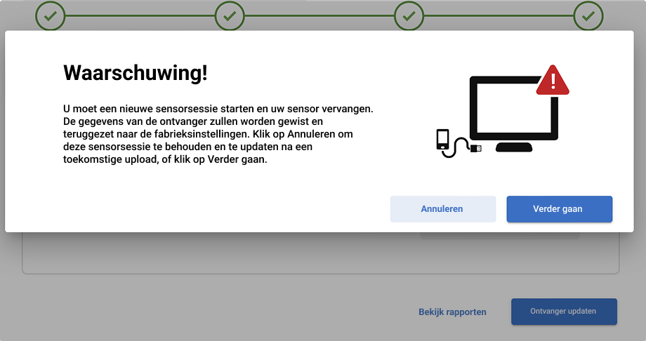 Als u zich in een actieve sensorsessie bevindt, ziet u onderstaande pop-up. Als u ervoor kiest om op dat ogenblik te updaten, moet u uw sensorsessie beëindigen en na de update een nieuwe starten. De gegevens van uw ontvanger zullen uit de ontvanger worden gewist en worden gereset naar de fabrieksinstellingen.
