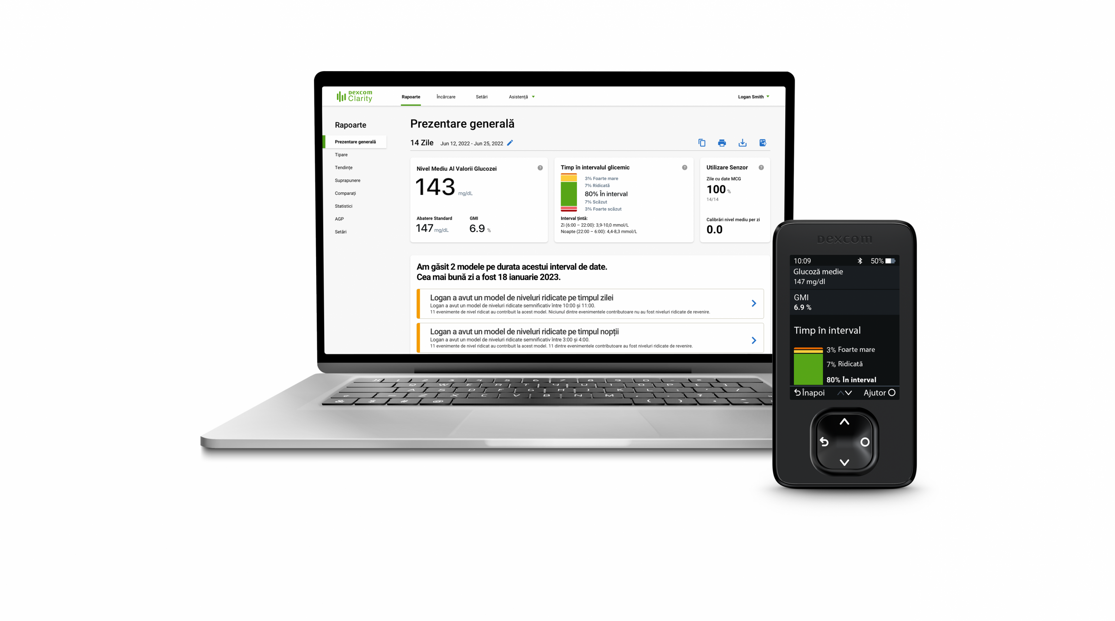 În fila Rapoarte, puteți vizualiza Sinteza datelor dumneavoastră cu privire la nivelul glucozei pentru o perioadă de timp selectată, nivelul mediu al glucozei, indicatorul de management al glucozei (GMI) estimate și durata încadrării în intervalul de valori țintă.
