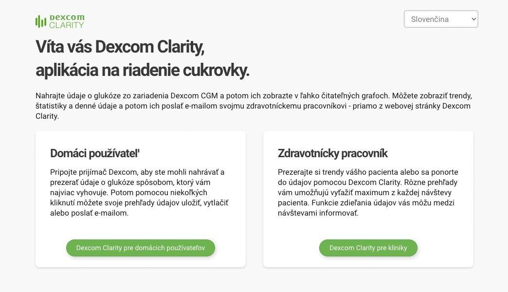 Krok č. 1 – Prihláste sa do Dexcom Clarity pomocou notebooku alebo počítača na adrese https://clarity.dexcom.eu/ a kliknite na „Dexcom Clarity pre domácich používateľov“.