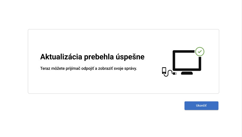 Po dokončení nahrávania sa zobrazí táto obrazovka na potvrdenie, že aktualizácia prebehla úspešne. Stlačte tlačidlo „ukončiť“, odpojte prijímač a spustite novú reláciu senzora.