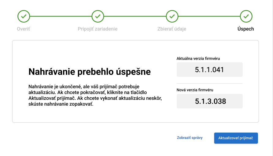 Zároveň bude v rámci procesu aktualizácie potrebné, aby ste ukončili reláciu snímača a po aktualizácii prijímača začali novú reláciu. Počas aktualizácie budú z prijímača vymazané vaše údaje a prijímač bude resetovaný na výrobné nastavenia. Údaje budú uložené v dočasnej anonymnej relácii a budú k dispozícii len 24 hodín. Počas tohto obdobia budete môcť vygenerovať a stiahnuť prehľad, ale vaše údaje nebudú uložené.