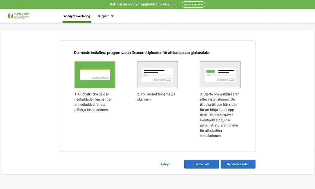 Steg 4: Om du inte tidigare har installerat “Dexcom Uploader” så kommer du att få en uppmaning att ladda ner programmet till din dator. Om du redan har “Dexcom Uploader” på din dator, gå då vidare till Steg 5.