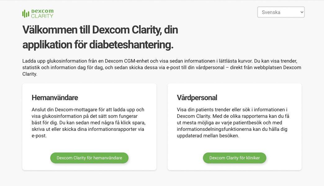 Steg 1: Logga in på Dexcom Clarity på din bärbara eller stationära dator genom att besöka https://clarity.dexcom.eu/ och klicka på “Dexcom Clarity for Home Users”